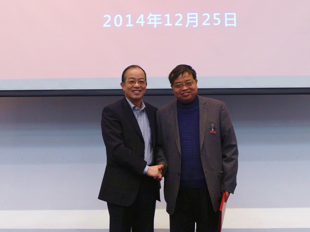 宋立群副校长为陈学明教授(右)颁发聘书、佩戴校徽