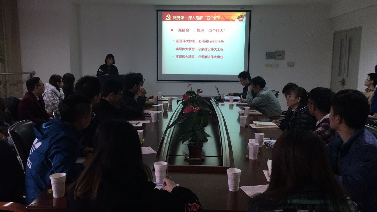 会议首先由支部书记讲微党课,对十九大报告中的“新时代、新使命、新思想、新征程”进行了深入解读,在展示标注历史坐标的“新时代”时,以图片展的形式直观地展现了国家、上海和东华五年的成就,并深入解读了十九大报告中对于创新的要求。