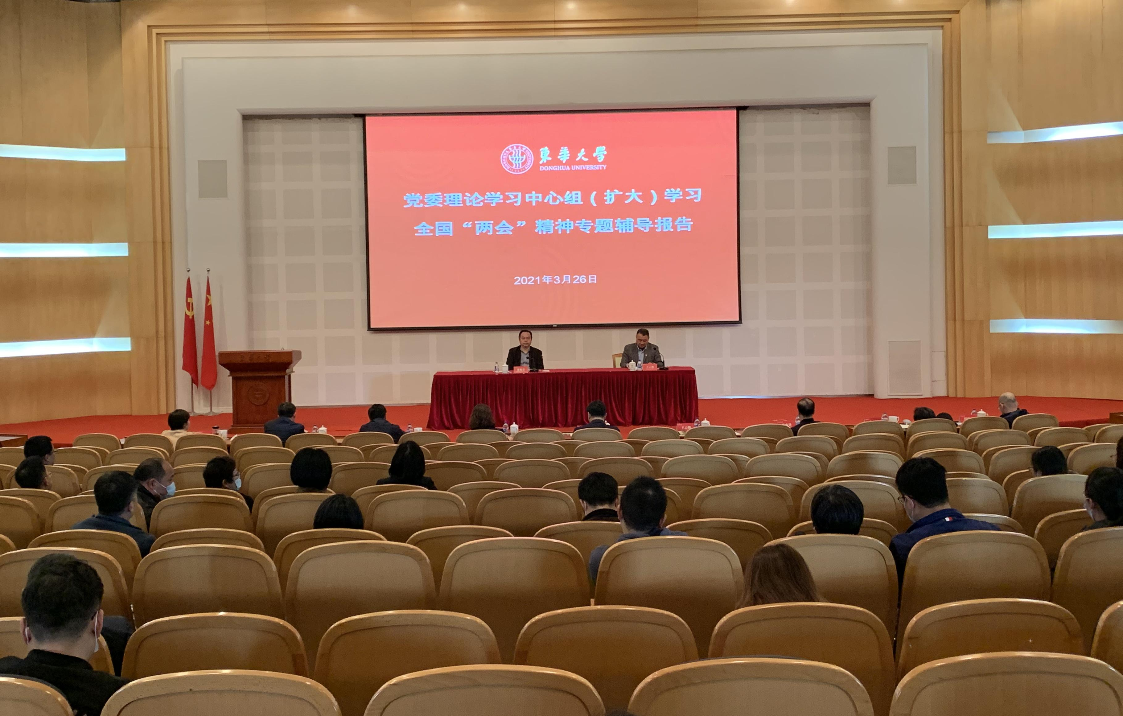3月26日,学校党委理论学习中心组在松江校区举行扩大学习会,邀请全国人大代表、上海社会科学院研究员张兆安作“两会”精神专题辅导报告。党委书记刘承功,党委副书记崔运花、王云骏,副校长邱高、陈南梁、舒慧生、李炜,党委常委朱英、任晓杰出席会议。王云骏主持学习会。